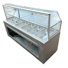 The Food Warmer (Bain Marie) with curved glass is designed for efficient food holding and attractive presentation in commercial environments. Ideal for restaurants, buffets, hotels, and catering services, it keeps food warm while allowing customers to view the meals clearly.