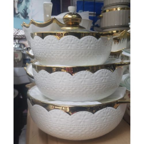Each set includes three casseroles in different sizes, making them suitable for a variety of dishes such as rice, stews, casseroles, soups, and baked meals. The matching lids help preserve heat and freshness while preventing spills and contamination.